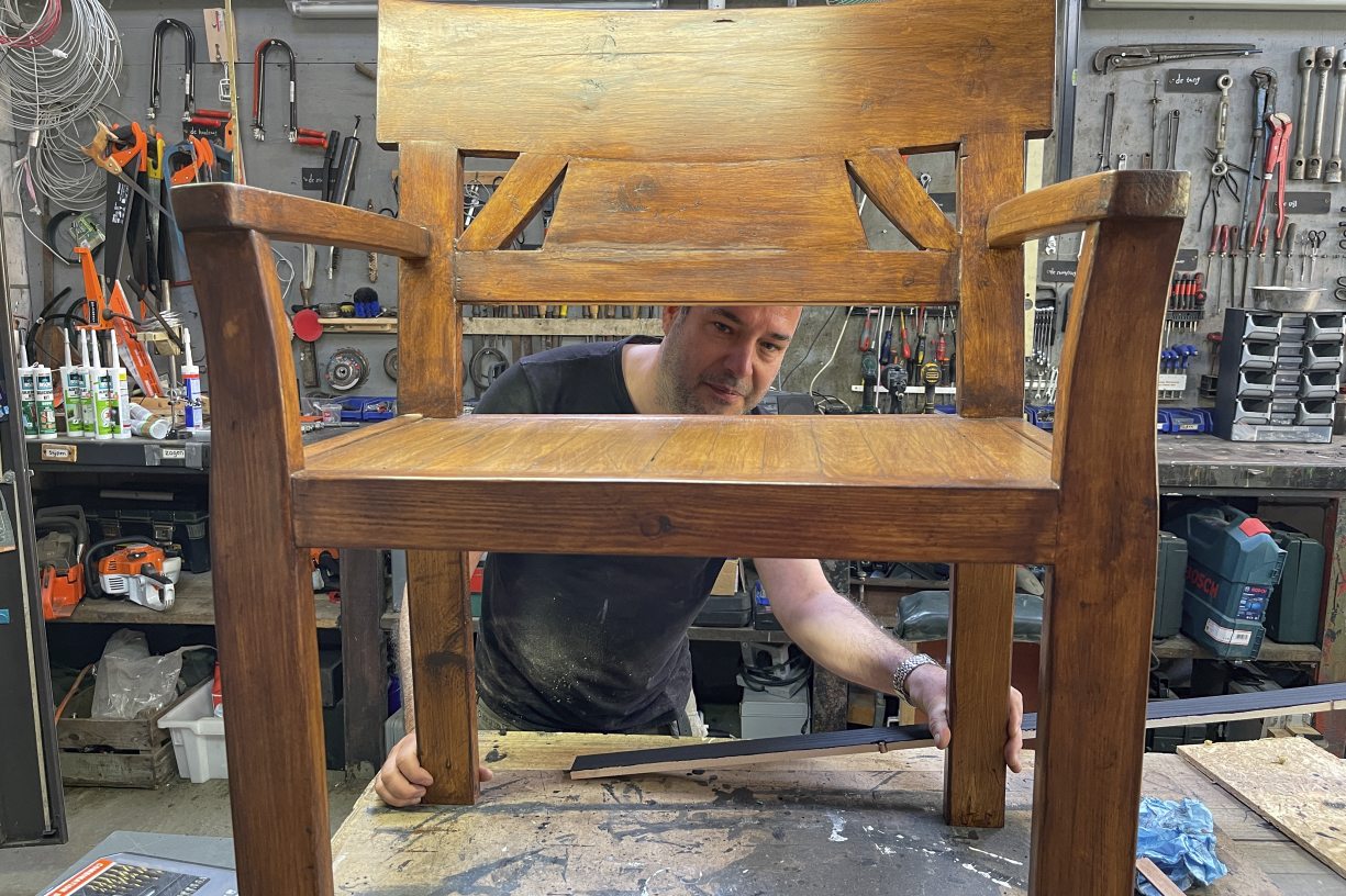 ‘Van huis uit ben ik meubelmaker’, vertelt hij, terwijl hij een uitgebreide rondleiding geeft door de gebouwen en op het terrein van Werkplaats 31@. ‘Dus werken met hout doe ik nog steeds heel graag. Dat kan ik ook goed.’ Mano maakte de eerste prototypes voor de opbouw van het schuiftafeltennis, maakt prachtige informatieborden, maar draait ook zijn hand niet om voor het opknappen van een stel antieke luiken van een huis in de buurt. En dat is nog maar een greep uit zijn werkzaamheden. Een van de leukste dingen vindt hij wel een bijzondere stoel die hij maakte voor een trotse opa. Twee kleinkinderen kunnen gezellig samen aanschuiven bij de tafel.